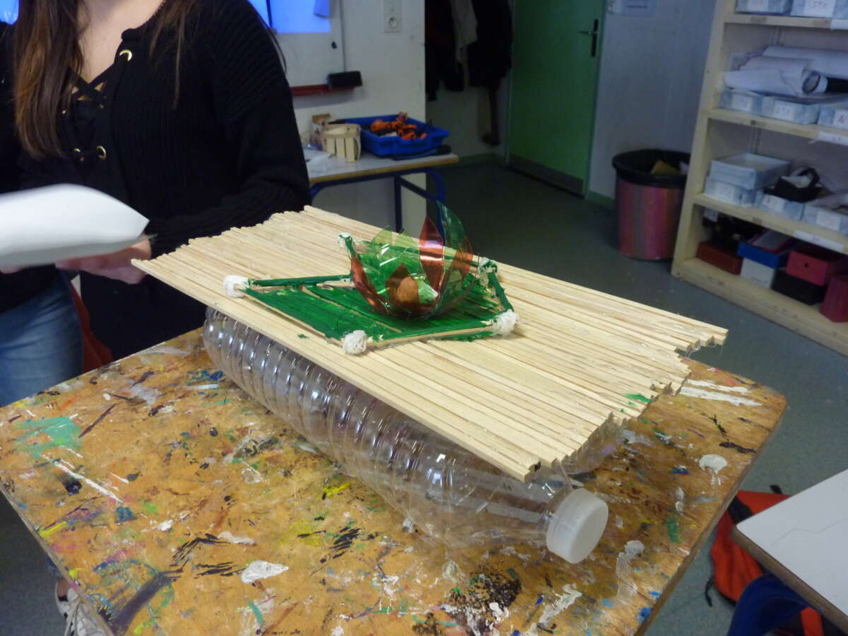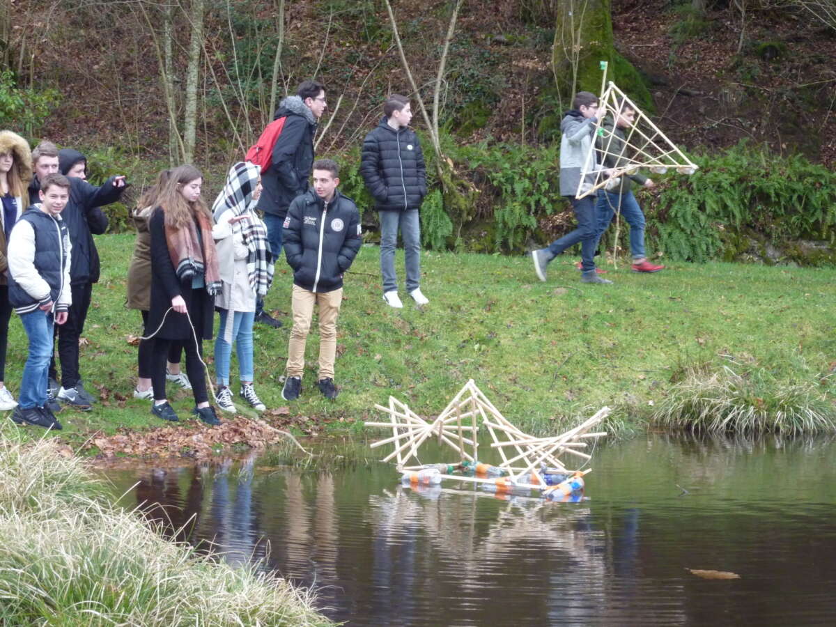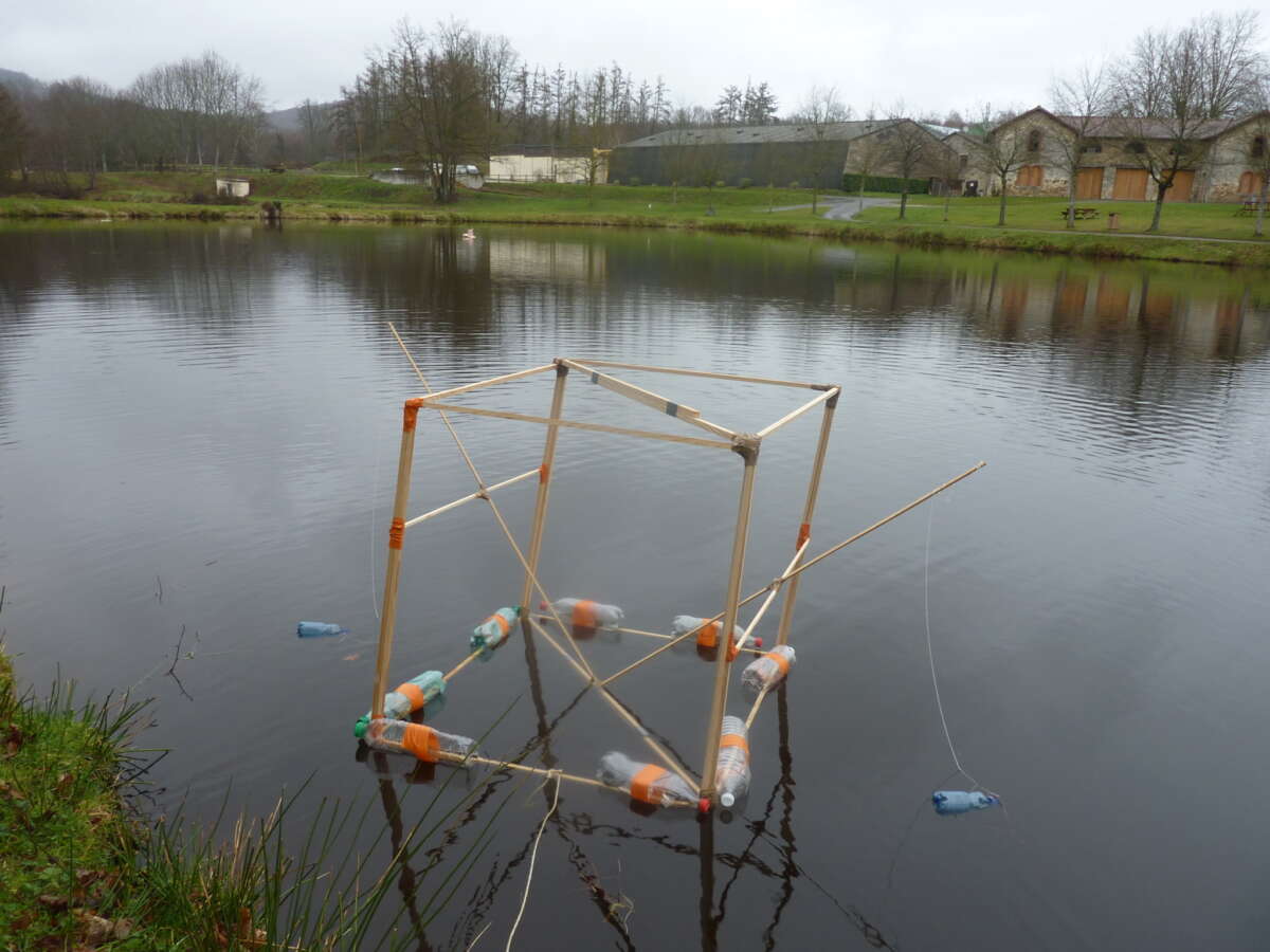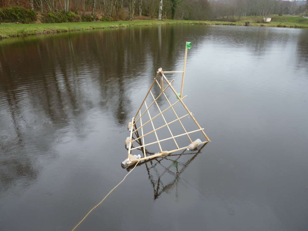 Après une première rencontre avec l’artiste, ce projet s’est construit sur deux journées de travail en établissement. Cela a permis aux élèves de plonger de manière immersive dans les questionnements plastiques, d’avoir le temps d’expérimenter et de remédier à leurs difficultés techniques. A la fin de ces deux jours, une première expérimentation des sculptures flottantes à été réalisée sur un petit lac aux abords du collège.