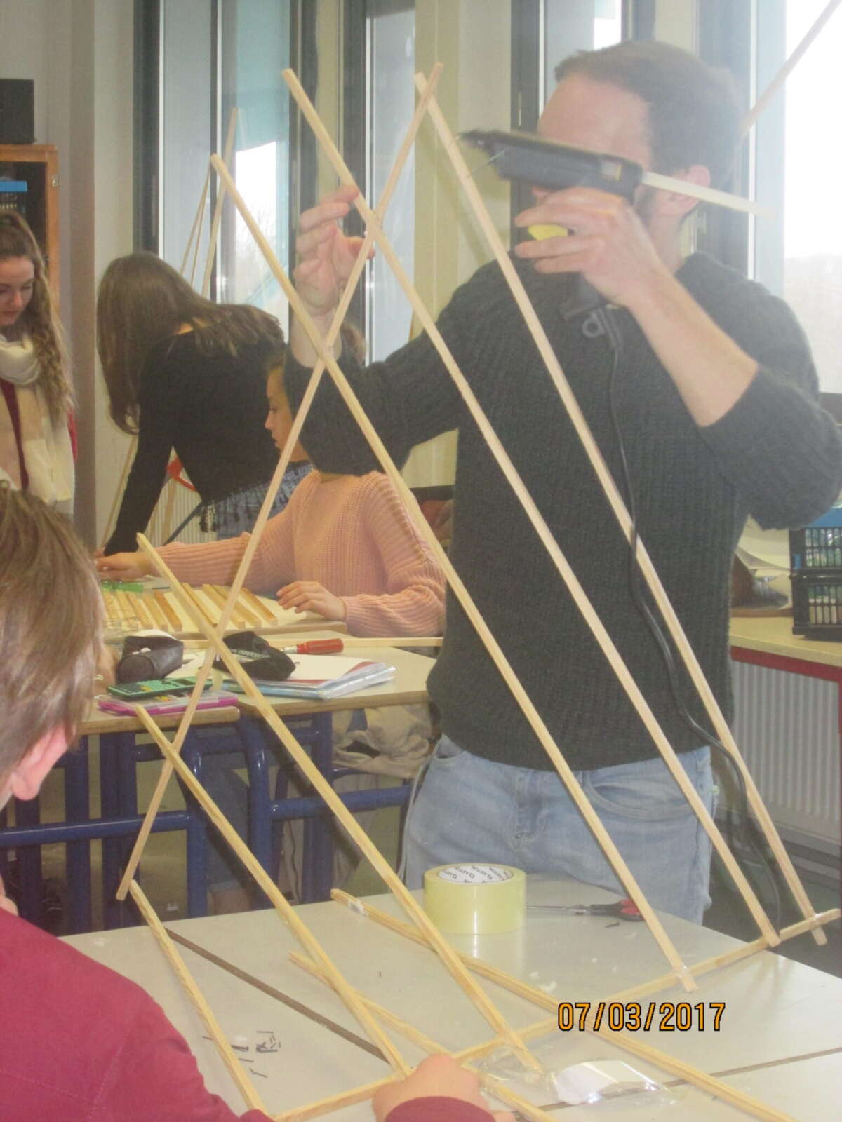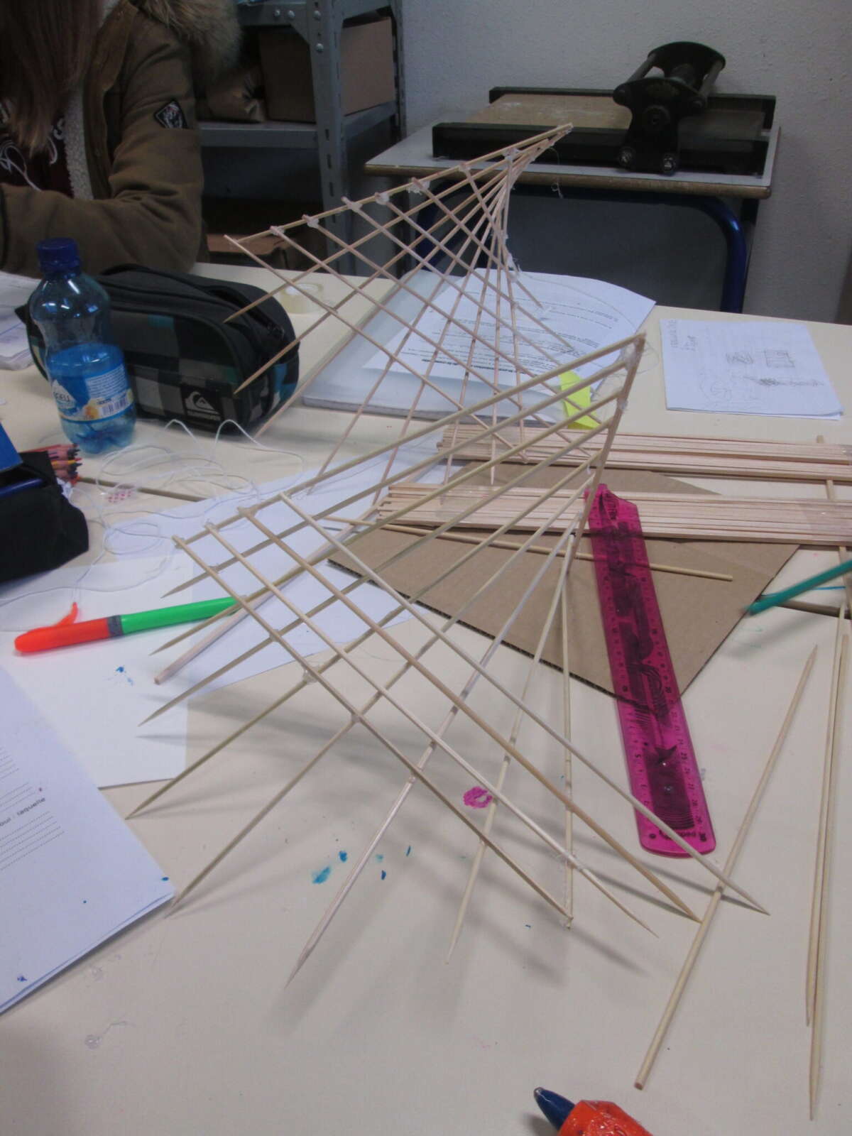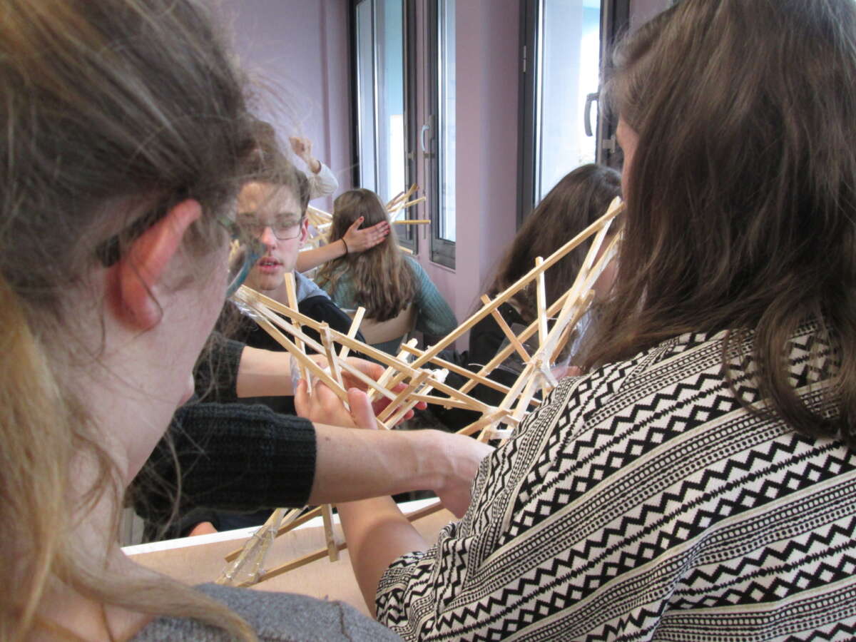 Suite aux premiers échanges avec l’équipe enseignante interdisciplinaire, arts et sciences, l’artiste a proposé un travail de construction d’objet, de sculptures flottantes, inspiré des formes mathématiques.