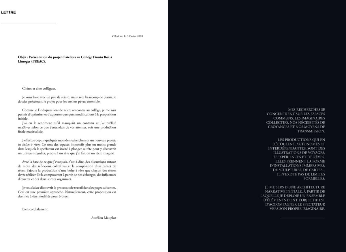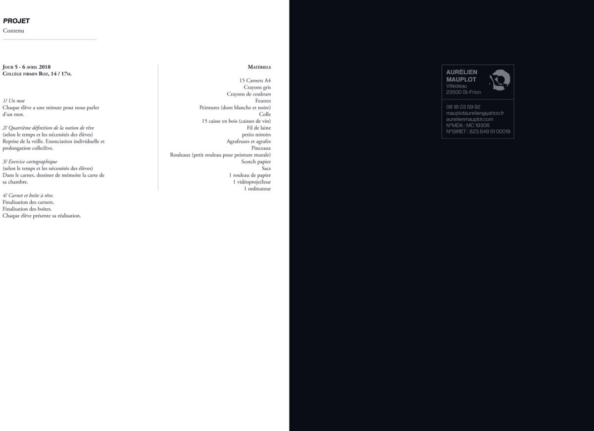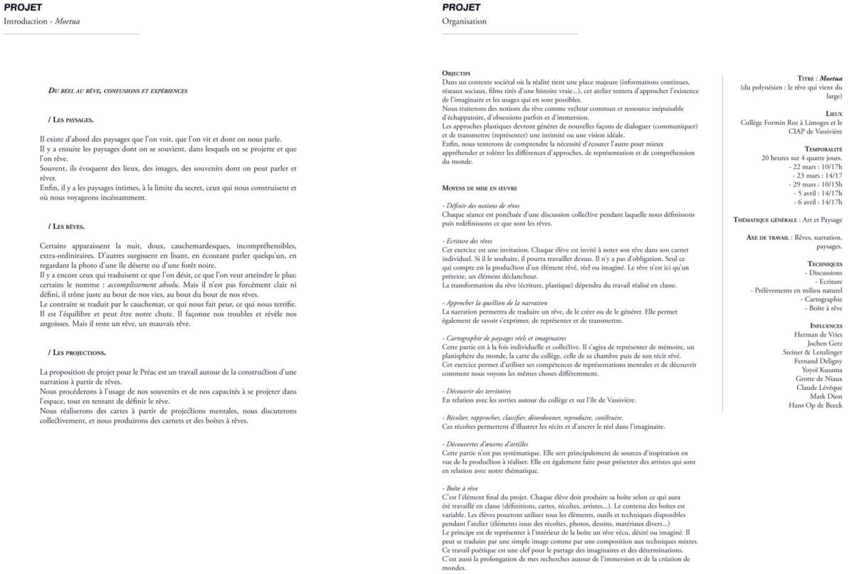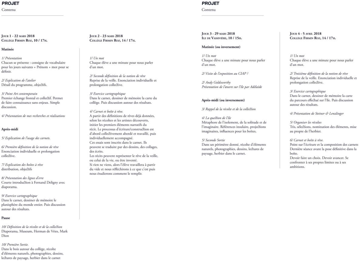 - Boîte à rêve c’est l’élément final du projet. Chaque élève doit produire sa boîte selon ce qui aura été travaillé en classe (définitions, cartes, récoltes, artistes...). Le contenu des boîtes est variable. Les élèves pourront utiliser tous les éléments, outils et techniques disponibles pendant l’atelier (éléments issus des récoltes, photos, dessins, matériaux divers...) Le principe est de représenter à l’intérieur de la boîte un rêve vécu, désiré ou imaginé. Il peut se traduire par une simple image comme par une composition aux techniques mixtes. Ce travail poétique est une clef pour le partage des imaginaires et des déterminations. C’est aussi la prolongation de mes recherches autour de l’immersion et de la création de mondes.”